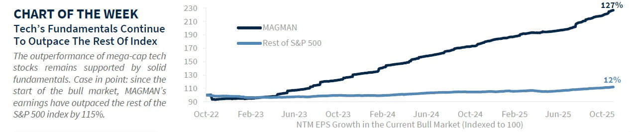 • Strong earnings growth: Unlike the late 1990s, today’s AI surge is driven by companies with solid fundamentals and real profits. Back then, businesses were rewarded simply for having ‘dotcom’ in their name. Today’s AI leaders are profitable and growing. For example, since the start of this bull market, our MAGMAN* composite has increased earnings by 127%, compared to just 12% for the rest of the S&P 500. Better than expected results in 3Q25 reinforce this trend. Even Fed Chair Jerome Powell highlighted the distinction in his recent remarks, noting that AI-related capital spending is now a meaningful contributor to US economic growth. NVIDIA’s earnings next Wednesday will also be key.